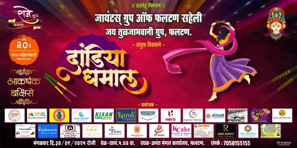 राजे ग्रुप फलटण, जायंटस् ग्रुप ऑफ फलटण सहेली आणि जय तुळजाभवानी ग्रुप, फलटण यांच्या संयुक्त विद्यमाने नवरात्रोत्सवाचे औचित्य साधून, ‘दांडिया धमाल’ या कार्यक्रमाचे आयोज फलटण शहरातील महिला आणि युवतींसाठी करण्यात आले आहे.