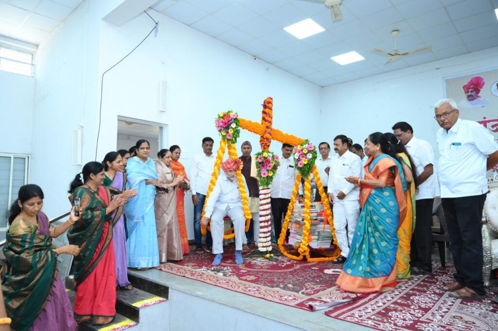 श्रीमंत संजीवराजे यांच्या ६१ पूर्ती अभिष्टचिंतन सोहळ्यानिमित्त प्रशालेत ग्रंथ तुला करताना प्रशालेचे शिक्षक वृंद व इतर मान्यवर