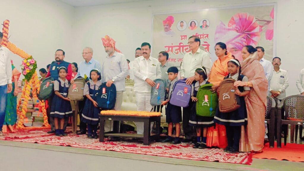 श्रीमंत संजीवराजे यांच्या ६१ पूर्ती अभिष्टचिंतन सोहळ्यानिमित्त शालेय दप्तरांचे वाटप करताना प्रशालेचे शिक्षक वृंद व इतर मान्यवर