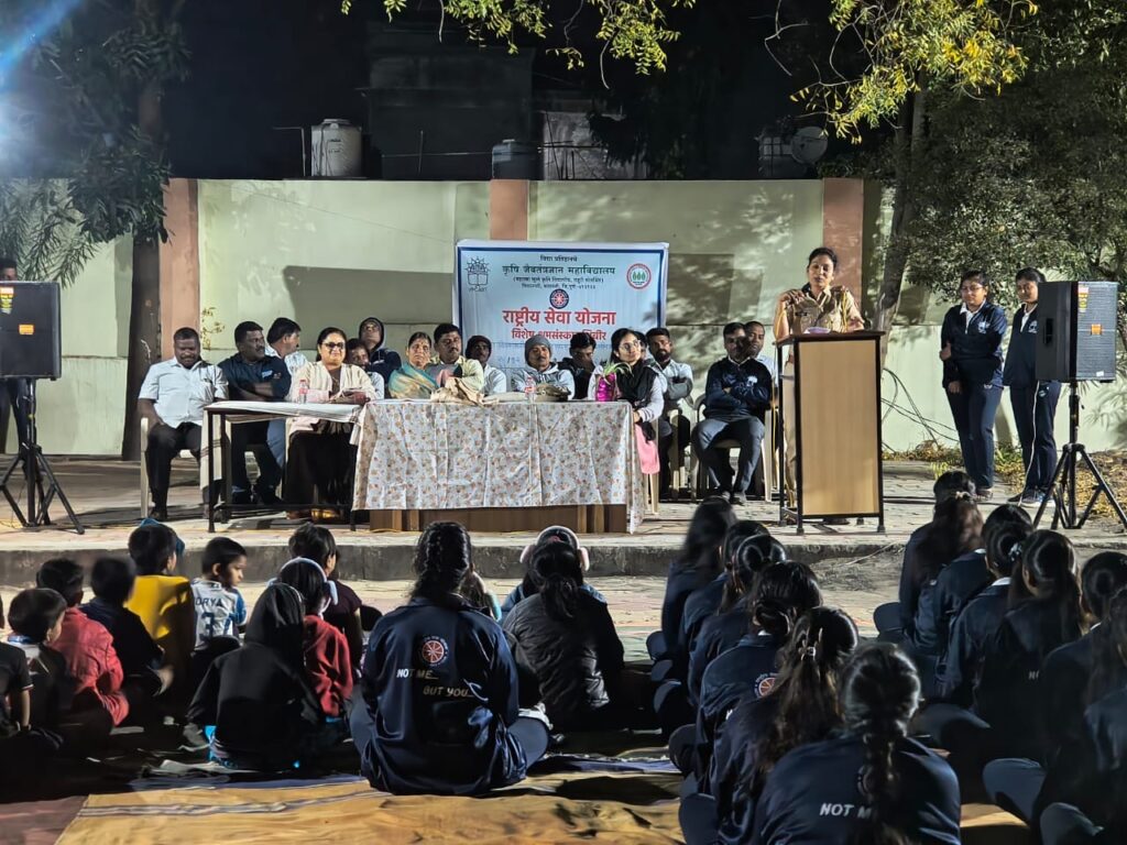 महात्मा फुले कृषी विद्यापीठ राहुरी संलग्न विद्या प्रतिष्ठानचे कृषी जैव तंत्रज्ञान महाविद्यालय,बारामती यांच्या वतीने २४ ते ३०डिसेबर २०२५ या दरम्यान राष्ट्रीय सेवा योजनेचे श्रमसंस्कार शिबिराचे आयोजन मौजे कन्हेरी ता बारामती येथे आयोजित केलेले आहे. शिबिराच्या उद्घाटनप्रसंगी प्रमुख पाहुण्या म्हणून सौ.. धनश्री भगत (पोलीस उपनिरीक्षक, बारामती ग्रामीण पोलीस स्टेशन) लाभल्या होत्या. यांनी विद्यार्थ्यांना स्पर्धा परीक्षेचे मार्गदर्शन तसेच समाजात घडणाऱ्या विविध गुन्ह्यांबाबत सविस्तर माहिती दिली. त्यांनी तरुणांनी स्पर्धा परीक्षांबरोबरच सामाजिक जबाबदारीची जाणीव ठेवावी, असे आवाहन केले.