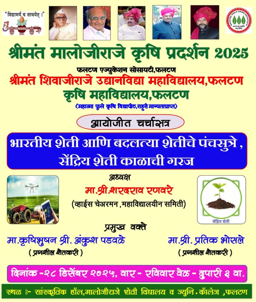 फलटण टुडे वृत्तसेवा ( फलटण दि २७ डिसेंबर २०२५):-फलटण एज्युकेशन सोसायटी संचलित श्रीमंत शिवाजीराजे उद्यानविद्या महाविद्यालय व कृषी महाविद्यालय, फलटण आयोजित श्रीमंत मालोजीराजे कृषी प्रदर्शन 2025 च्या तिसऱ्या दिवशी कृषी प्रदर्शनातील सर्व निविष्ठा कंपन्यांना फलटण व परिसरातील शेतकरी, युवक, महिला बचत गट, महिला शेतकरी बहुमोल प्रतिसाद मिळाला. फलटण नगरपरिषदेचे माजी नगरसेवक व मे. गव्हर्निंग कौन्सिलचे सदस्य श्रीमंत अनिकेतराजे नाईक निंबाळकर यांनी सायंकाळी कृषी प्रदर्शनाला भेट दिली व कृषी प्रदर्शनातील सर्व स्टॉलची सविस्तर माहिती घेतली. तिसऱ्या दिवशी पर्यंत फलटण व परिसरातील २५००० शेतकऱ्यांनी कृषी प्रदर्शनाला भेट देऊन बहुमोल असा प्रतिसाद दिला. कृषी प्रदर्शन आयोजन समितीतर्फे श्रीमंत अनिकेतराजे नाईक निंबाळकर यांचा सन्मान करण्यात आला. कृषि प्रदर्शनाच्या कालावधीमध्ये फलटण परिसरातील शेतकऱ्यांनी शेती तंत्रज्ञानाचा फायदा घेऊन प्रदर्शनाला उदंड प्रतिसाद द्यावा असे आवाहन आयोजकांनी व्यक्त केले