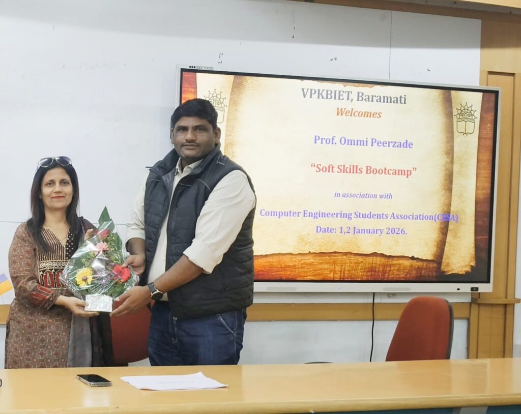 विद्या प्रतिष्ठानचे कमलनयन बजाज इन्स्टिट्यूट ऑफ इंजिनिअरिंग अँड टेक्नॉलॉजी (VPKBIET), बारामती येथे द्वितीय वर्ष संगणक अभियांत्रिकी शाखेच्या विद्यार्थ्यांसाठी Soft Skills and Personality Development Training Program अंतर्गत विशेष मुलाखत कौशल्य (Interview Skills) प्रशिक्षण सत्राचे यशस्वी आयोजन करण्यात आले.