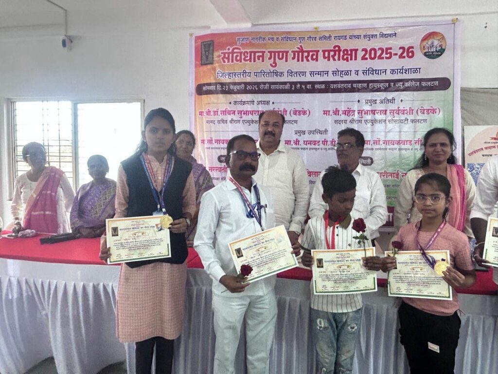 सुजाण नागरीक मंच व संविधान गुण गौरव समिती रायगड यांच्या संयुक्त विद्यमाने संविधान गुण गौरव परीक्षा २०२५-२६ चे आयोजन मुधोजी हायस्कूल व ज्युनिअर कॉलेजमध्ये परीक्षा केंद्र होते . या केंद्राच्या केंद्रप्रमुख म्हणून सौ. सुजाता बनसोडे यांनी काम पाहिले .