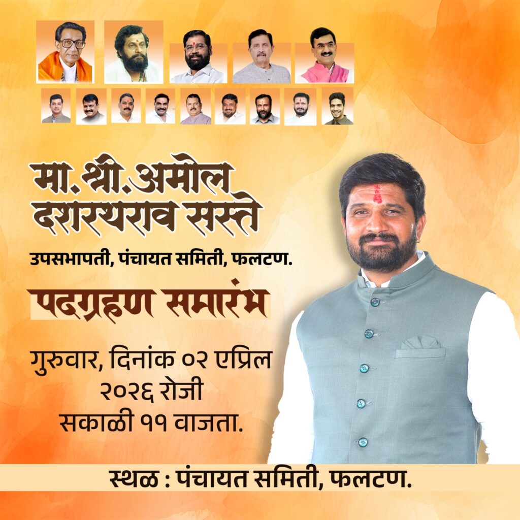 फलटण टुडे वृत्तसेवा ( फलटण, दि १ एप्रिल २०२६): – फलटण पंचायत समितीच्या उपसभापतीपदी अमोल दशरथ सस्ते यांची बिनविरोध निवड झाल्यानंतर त्यांच्या पदग्रहण सोहळ्याचे आयोजन गुरुवार, दिनांक ०२ एप्रिल २०२६ रोजी सकाळी १०:३० वाजता पंचायत समिती, फलटण येथे करण्यात आले आहे.