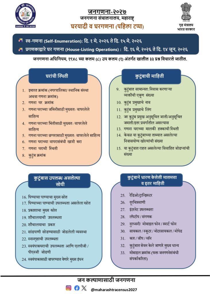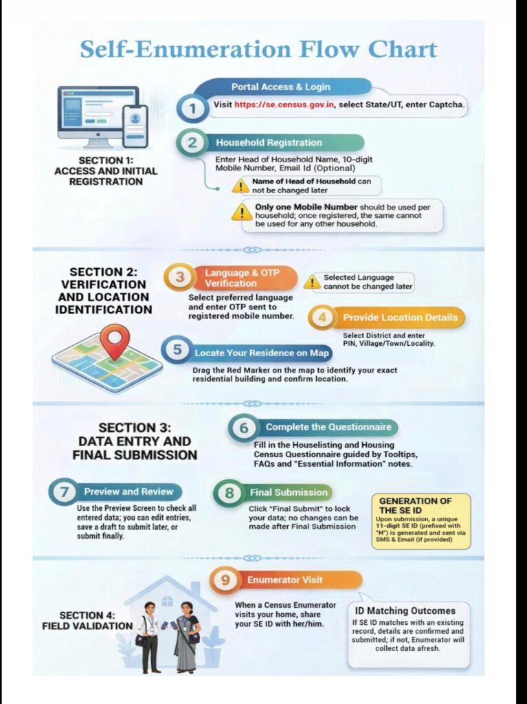 दि. १ मे २०२६ ते दि. १५ मे २०२६ या कालावधीत नागरिकांना https://se.census.gov.in या अधिकृत संकेतस्थळावर जाऊन स्वतःची माहिती भरता येणार आहे. या पद्धतीमुळे नागरिकांचा आणि प्रगणकांचा वेळ वाचणार असून माहिती अधिक अचूकपणे नोंदवली जाणार आहे. प्रसिद्ध करण्यात आलेल्या प्रवाह-आरेखानुसार (फ्लोचार्ट) नागरिकांनी पुढील टप्प्यांनुसार प्रक्रिया पूर्ण करायची आहे. सुरुवातीला अधिकृत संकेतस्थळावर प्रवेश करून राज्य निवडून नोंदणी (रजिस्ट्रेशन) करावी लागेल. त्यानंतर कुटुंब प्रमुखाचे नाव, दहा अंकी मोबाइल क्रमांक व ई-मेल पर्यायी नमूद करावा लागेल. नोंदणीनंतर मोबाइलवर येणाऱ्या ओटीपीद्वारे पडताळणी पूर्ण करून पसंतीची भाषा निवडावी लागेल. यानंतर जिल्हा, पिनकोड, गाव किंवा परिसराची माहिती भरून नकाशावर स्वतःचे अचूक निवासस्थान निश्चित करावे लागेल. पुढील टप्प्यात घर व कुटुंबाशी संबंधित सविस्तर प्रश्नावली (एकूण ३३ प्रश्न ) भरून माहिती सादर करायची आहे. अंतिम सादरीकरणापूर्वी (फायनल सबमिशन) माहिती तपासण्याची सुविधा उपलब्ध असून एकदा अंतिम सादरीकरण केल्यानंतर कोणताही बदल करता येणार नाही.